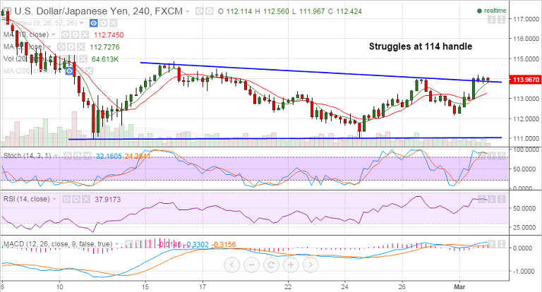 - 5-DMA at 113.50 is immediate support ahead of 113.37 (Feb 17th lows), while resistance above 114 is seen at 114.18 (March 1st highs) and then 114.32 (Feb 18th highs).