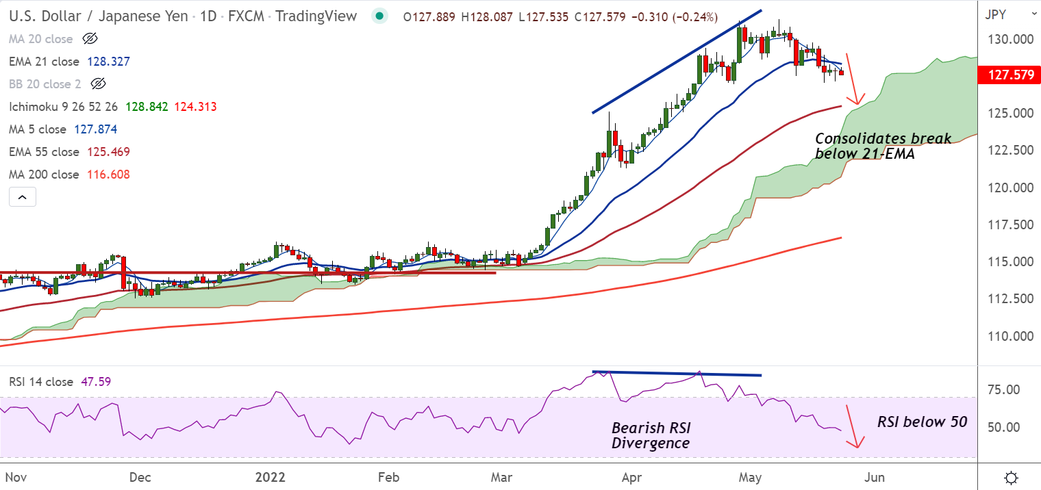 Summary: USD/JPY trades with a bearish bias. Scope for dip till 126. Bearish invalidation above 21-EMA.