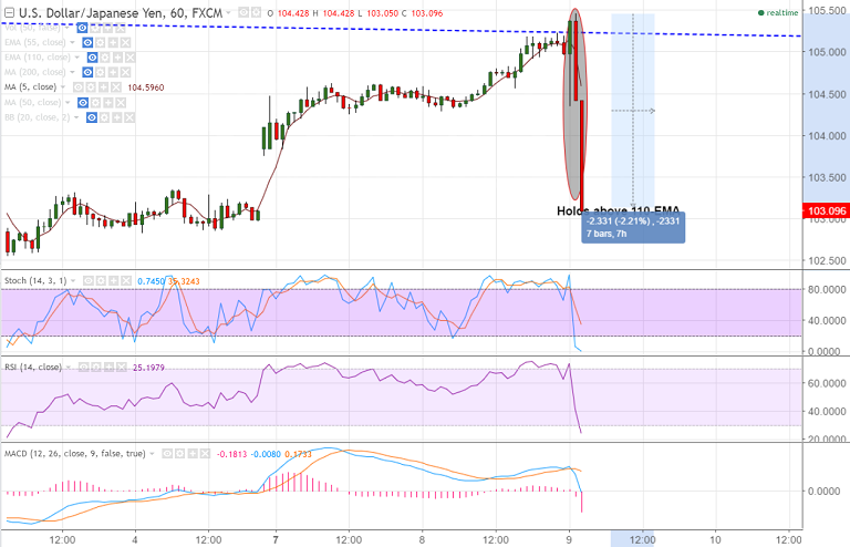 - USD/JPY sees a massive slump of over 2% from day's high of 105.46 to as low as 103 on rising prospects of a trump victory.
