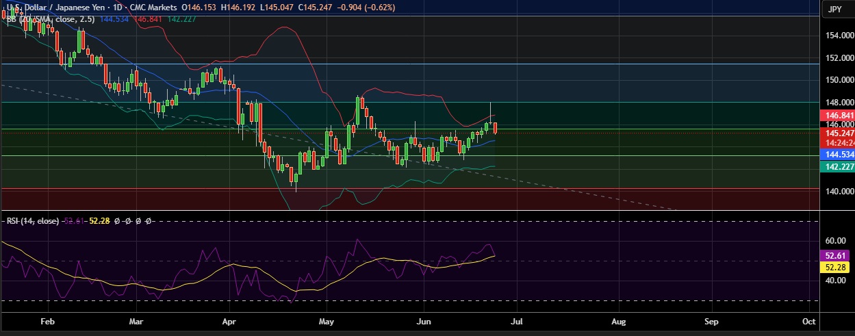 • Key resistance levels: 146.20 (June 26th high), 146.78 (Upper Bollinger Band), and 148.11 (50%fib).