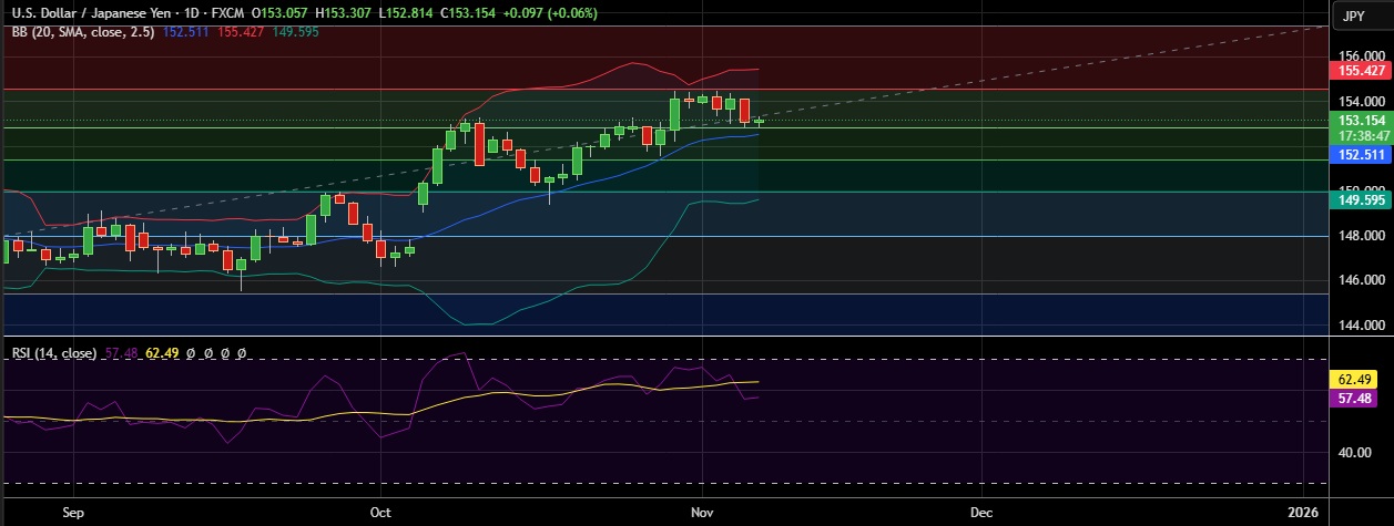 • Immediate resistance is located at 154.56(23.6%fib), any close above will push the pair towards 155.50(Higher BB).