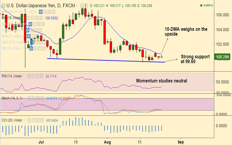 - A tepid bounce in the pair was rejected at session highs by 100.52, stiff resistance seen by 10-DMA at 100.59.