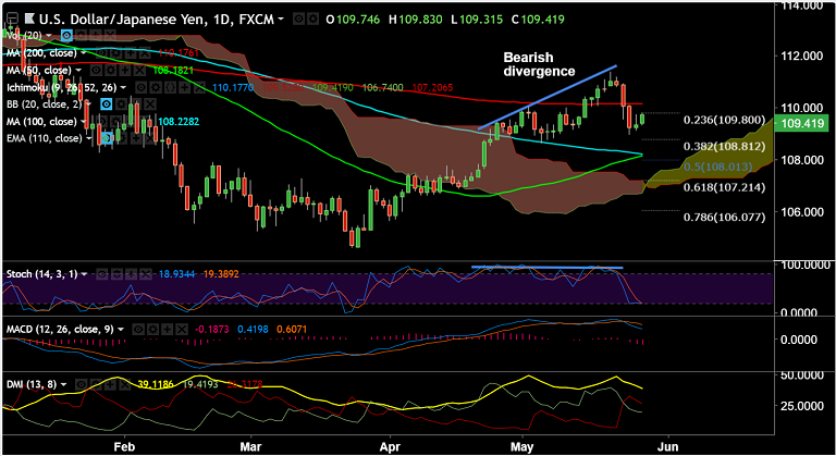 Support levels - 109, 108.81 (38.2% Fib), 108.20 (nearly converged 50 and 100 day MAs)