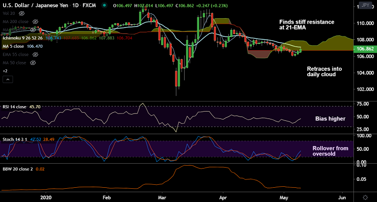 Price action has retraced into daily cloud and is just shy of 21-EMA resistance at 107.10. Other major hurdles align at 55-EMA at 107.77 and 110-EMA at 108.18.