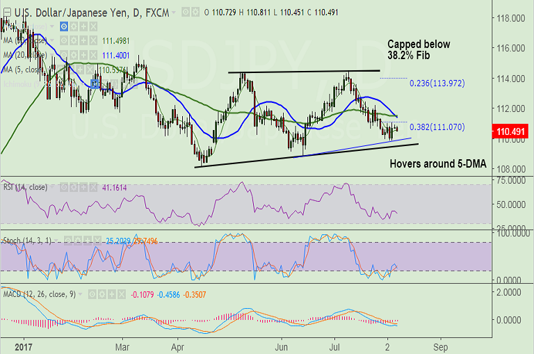 - The major is extending corrective slide post NFP rally, hovers around 5-DMA at 110.55.