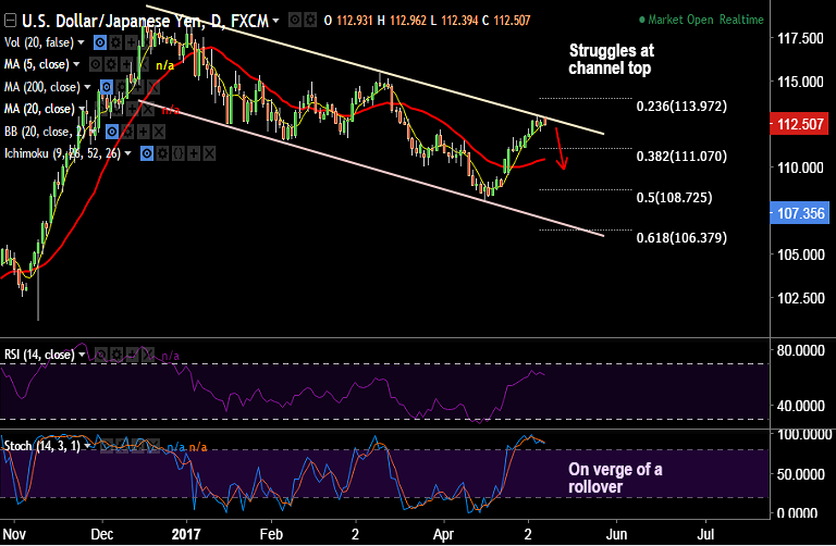 - Rollover of RSI and stochs from overbought zone with a close below 5-DMA currently at 112.47 will see test of 111 levels.