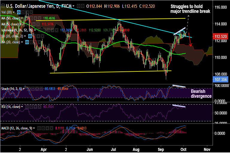 - USD/JPY fails to hold major trendline break, trades 0.25% lower on the day.