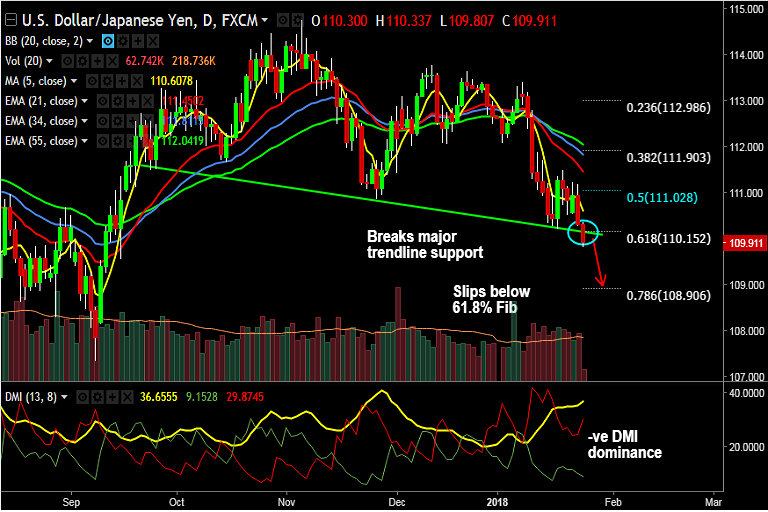 - Technical indicators are bearish. The pair has broken major trendline support at 110.15 and has slipped below 61.8% Fibo.