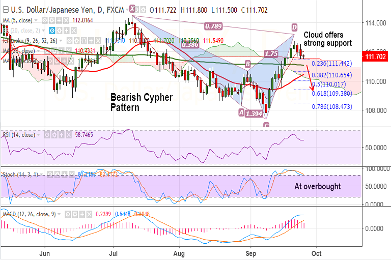 Support levels - 111.55 (cloud top), 111.08 (100-DMA), 110.65 (38.2% Fib retracement of 107.318 to 112.716 rally)