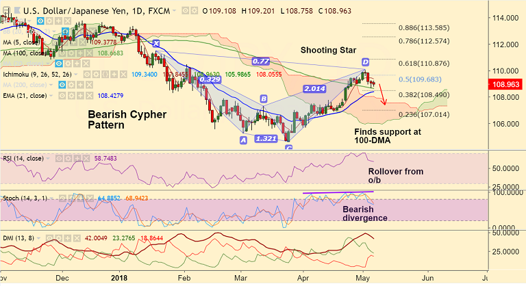 Support levels - 108.67 (100-DMA), 108.49 (38.2% Fib), 108.33 (20-DMA)