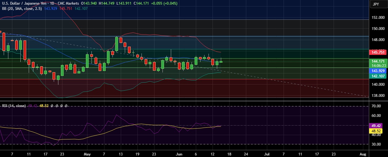 • Support is seen at 142.98(38.2%fib) and break below could take the pair towards 142.16(Lower BB).