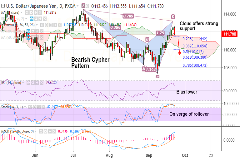 - Daily cloud at 111.60 offers strong support on the downside, we see further weakness on break below.