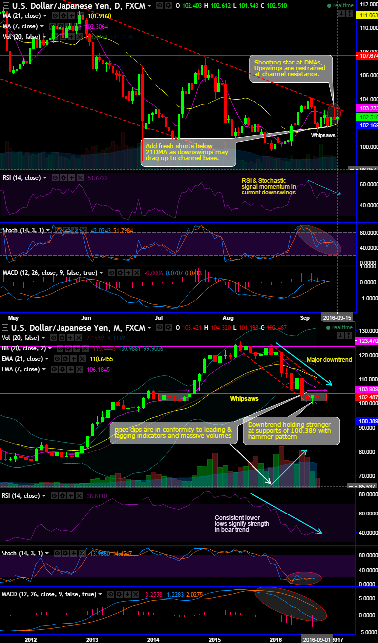 Considering previous downswings, despite whipsaws pattern the pair doesn't seem to evidence upswings as a shooting star appeared at 102.403 levels which is bearish in nature.