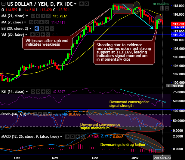 The current prices have dipped well above DMAs on daily charts, for now, don't expect the sharp rallies nor a steep slump as it is likely to test support at 113.169 levels, and it is better to go short upon breach below these levels that favors bears.