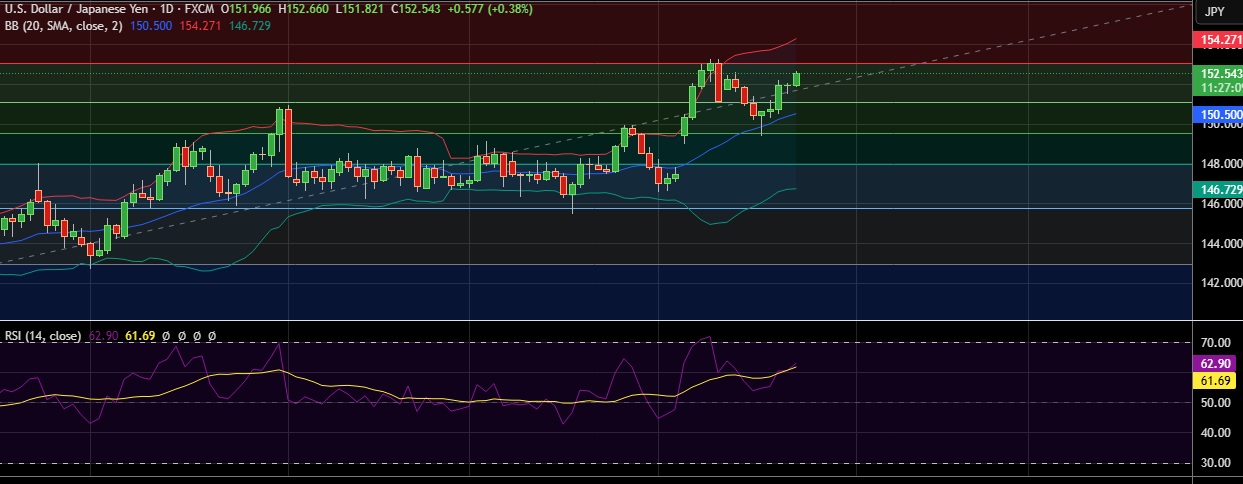 • Immediate resistance is located at 153.10(23.6%fib), any close above will push the pair towards 154.15(Higher BB).