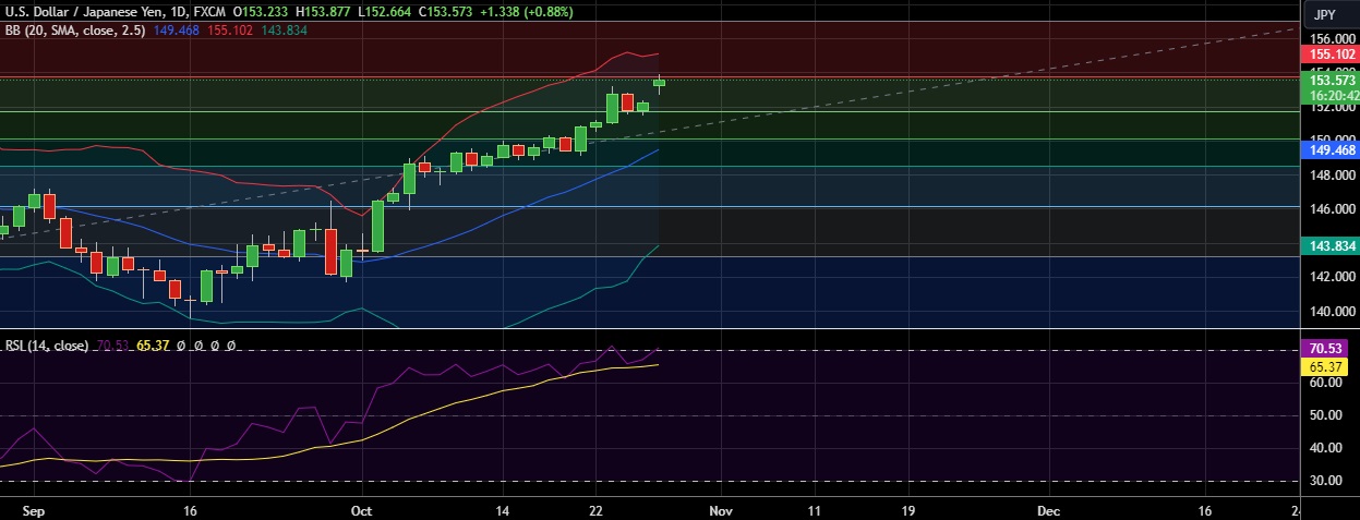 • Immediate resistance is located at 153.77(23.6%fib), any close above will push the pair towards 155.24 (Higher BB).