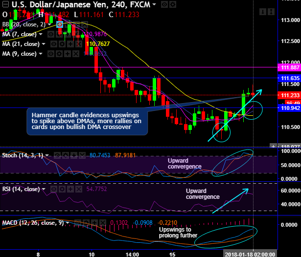 Chart pattern: USDJPY forms the long lasting range of monthly plotting and hammer pattern candle that is bullish in nature to signal more rallies in the days to come. Observe current upswings spike above DMAs with bullish crossover.