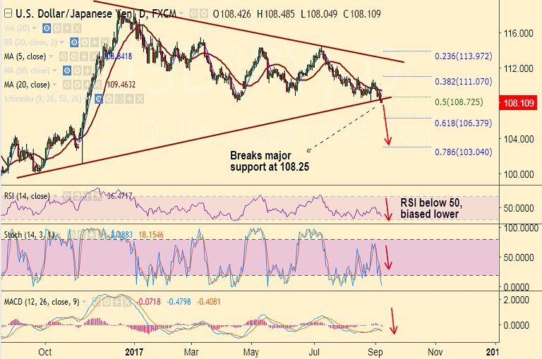 - The pair is struggling to break below 108 handle, a decisive break through will likely accelerate the fall.