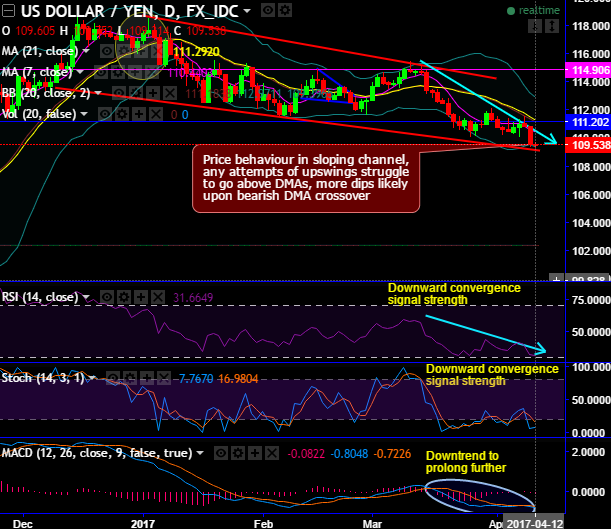 The current price behaviour of this pair has been sliding through sloping channel formation (refer daily chart). Bears have managed to hit the fresh 5-months lows at 109.553.