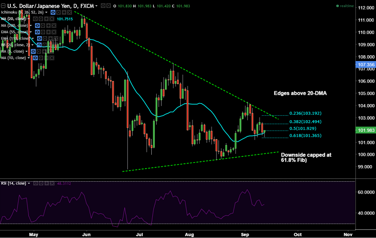 - Major support levels - 101.75 (20-DMA), 101.36 (61.8% Fib), 101.20 (Sept 7 low), 101 (trendline)