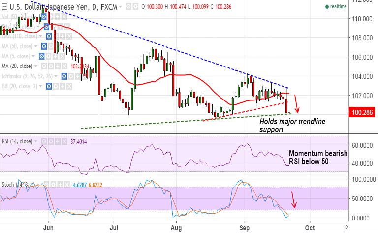 - USD/JPY trading a narrow range, downside holds major trendline support at 100.05.