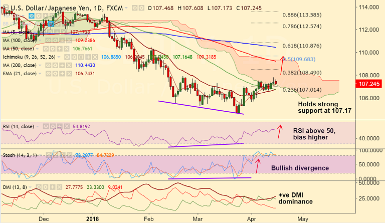 - On the flipside, break below 107.17 could see test of converged 50-DMA and 21-EMA at 106.74.