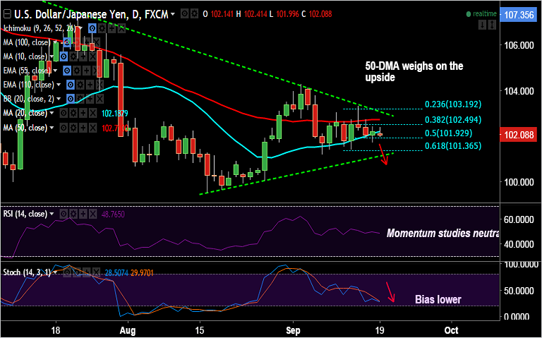 - Major resistance seen at 102.71 (50-DMA), only decisive break above to see reversal in the bearish trend.