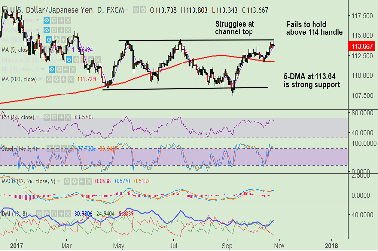 - USD/JPY hovers around 5-DMA at 113.64, edges higher from session lows at 113.34.