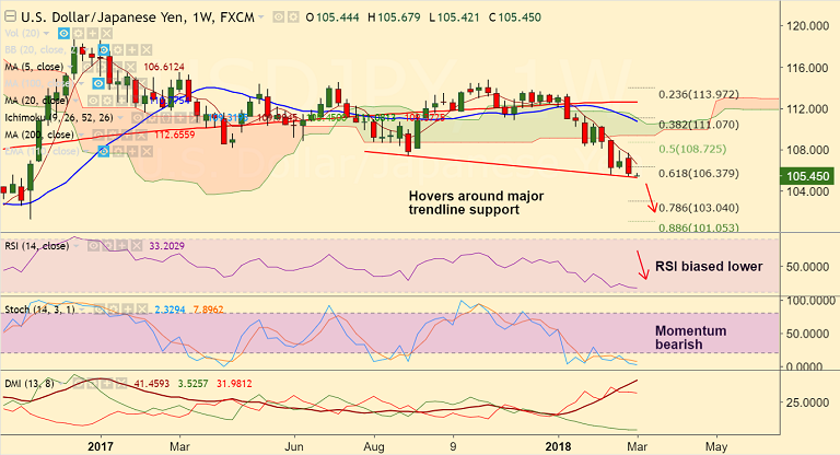 - The major is extending downward spiral since highs of 114.737 in Nov 2017, next bear target on violation at lies at 105.40 (major trendline support) could be 78.6% Fib at 103.04.