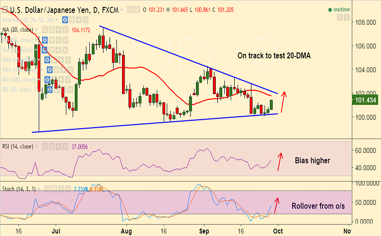 - Technical indicators have turned slightly bullish, we see scope for test of 20-DMA at 101.79. Break above finds next hurdle at major trendline at 102.15.