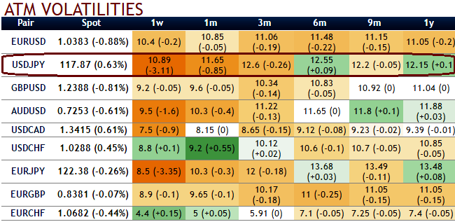 You could probably understand the shrinking vols from the above IV nutshell and both RVs and IVs have constantly been making lower lows, this would demonstrate much about underlying USDJPY sentiments