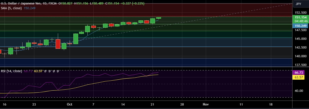 • Support is seen at 150.23 (5DMA) and break below could take the pair towards 149.14 (38.2%fib).