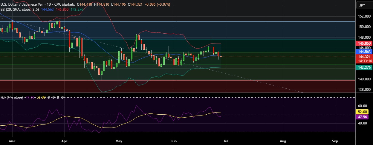 • Support levels: 145.73 (June 26th low), 142.76 (38.2%fib)and 142.25 (Lower BB)..