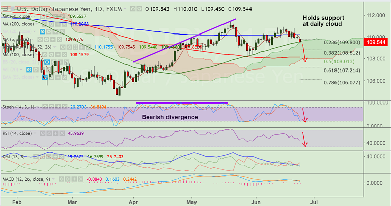 - Price action has taken support at daily cloud top at 109.46, break below will see further weakness. We then see scope for test of 100-DMA at 108.15.