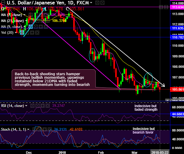 USDJPY attempts of rallies are restrained below 21-DMAs, the pair that is in bearish mood formed shooting star at 106.410 and 106.564 levels to signal weakness.