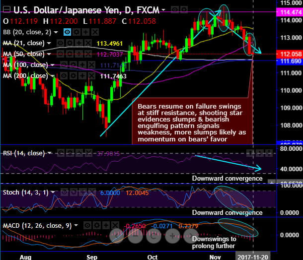 USDJPY pops up bearish engulfing pattern candle at 112.085 that signals more weakness in the days to come.