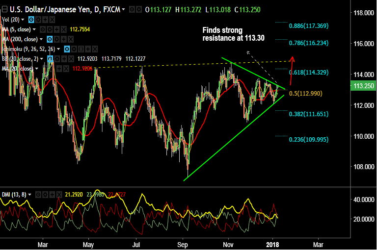 - Breakout at major resistance at 113.30 paves way for gains till 113.70 (upper BB).