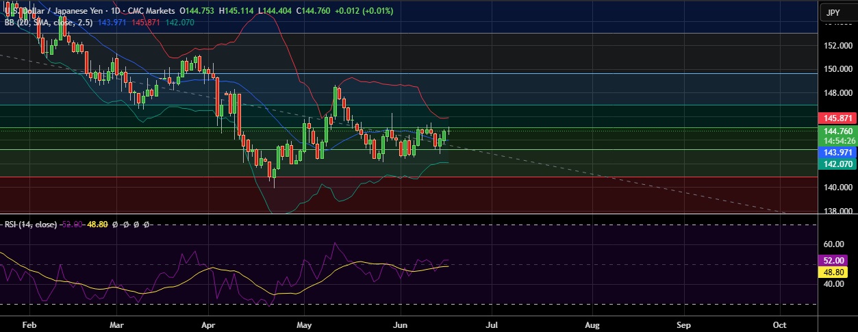 • Immediate resistance is located at 144.65 (50%fib), any close above will push the pair towards 145.76 (Higher BB).