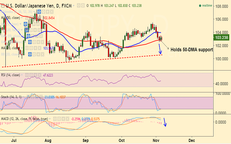 - The pair has held 50-DMA support at 102.84, break below likely to see drag upto 100.50 (trendline).