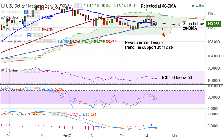 Support levels - 112.85 (trendline), 112, 111.60 (Feb 7 low), 111.16 (100-DMA)