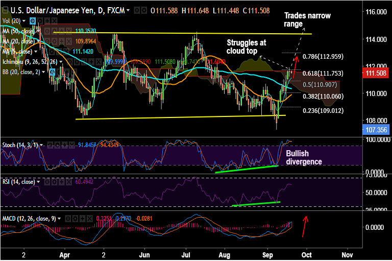 Resistance levels - 111.60 (cloud top), 111.75 (61.8% Fib retrace of 114.49 to 107.31 fall), 112.21 (200-DMA)