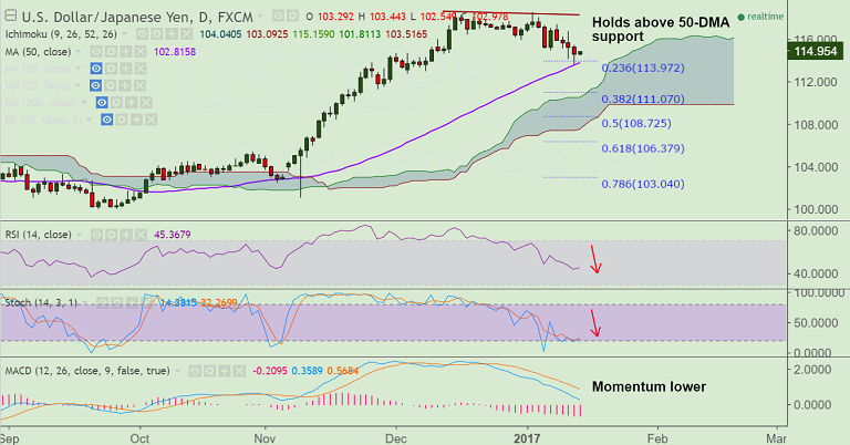 Support levels - 114.25 (Jan 11 low), 114, 113.97 (23.6% Fib of 98.78 to 118.66 rally), 113.56 (50-DMA)