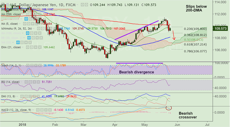 - Technical studies are turning bearish. The pair has slipped below 200-DMA. We see bearish divergence on daily charts which adds to downside pressure.