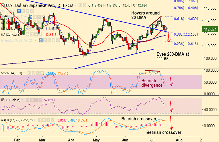 - Bearish Stochastics divergence keeps scope for further downside. We see bearish invalidation on break above 5-DMA at 113.10.