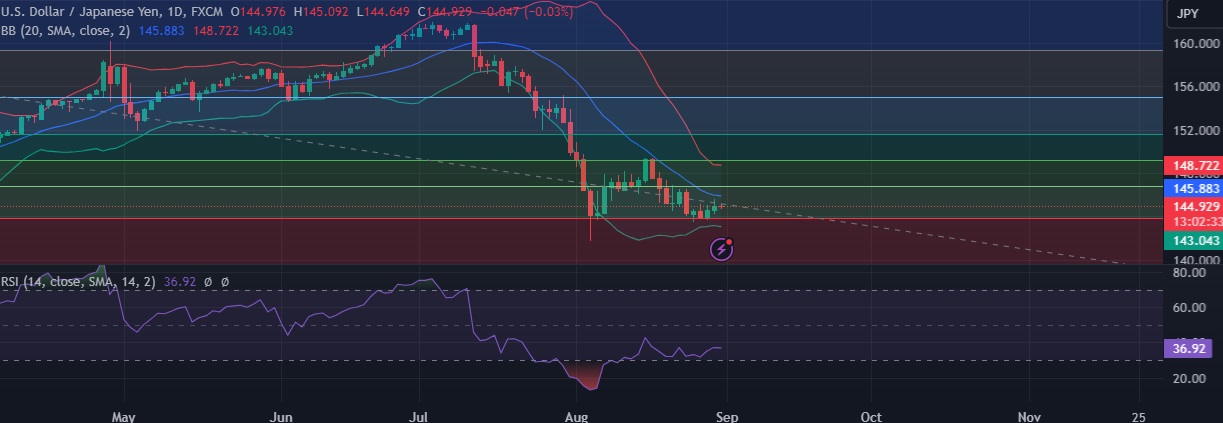 • Support is seen at 143.80 (23.6%fib) and break below could take the pair towards 143.10 (Lower BB).