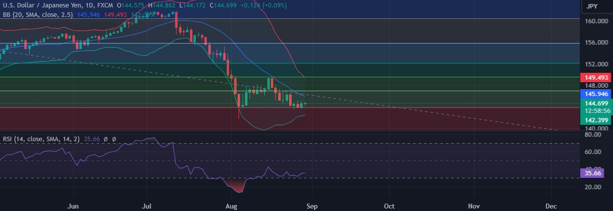 • Support is seen at 144.01 (38.2%fib) and break below could take the pair towards 142.29 (Lower BB).