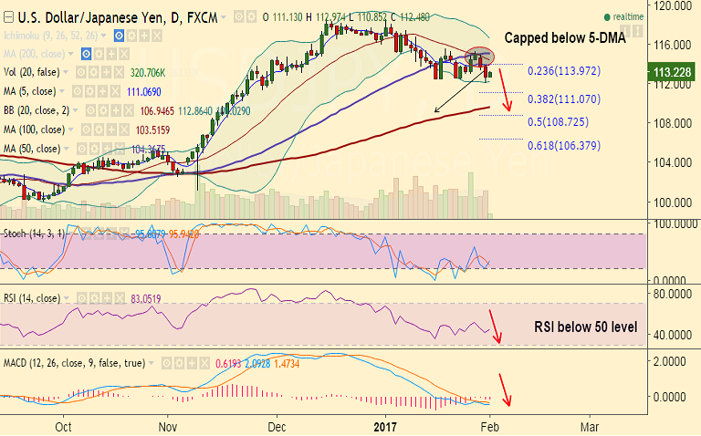 - The pair has broken below 50-DMA and we see scope for test of 111 levels (38.2% Fib).