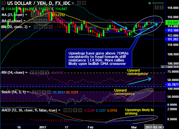 For intraday trading perspective, it is advisable to buy boundary binaries on dips upper strikes at 115.37 (upper BB) and lower strikes at 114.5203 (7DMA) which means upward travel maximum up to 20-25 pips and 25-30 on southward targets within the binary expiry duration.