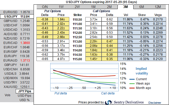 At spot reference: 112.89, USDJPY 3m risk reversals and IVs are indicating mounting hedging interests for downside risks (while articulating).