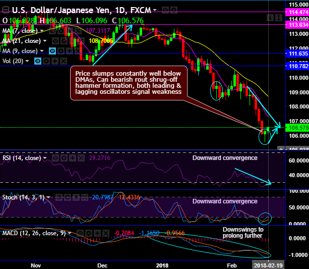 Chart pattern: USDJPY price slumps constantly remained well below DMAs despite today’s rallies. Hammer pattern has occurred at 106.272 levels that have shown mild upswings today.